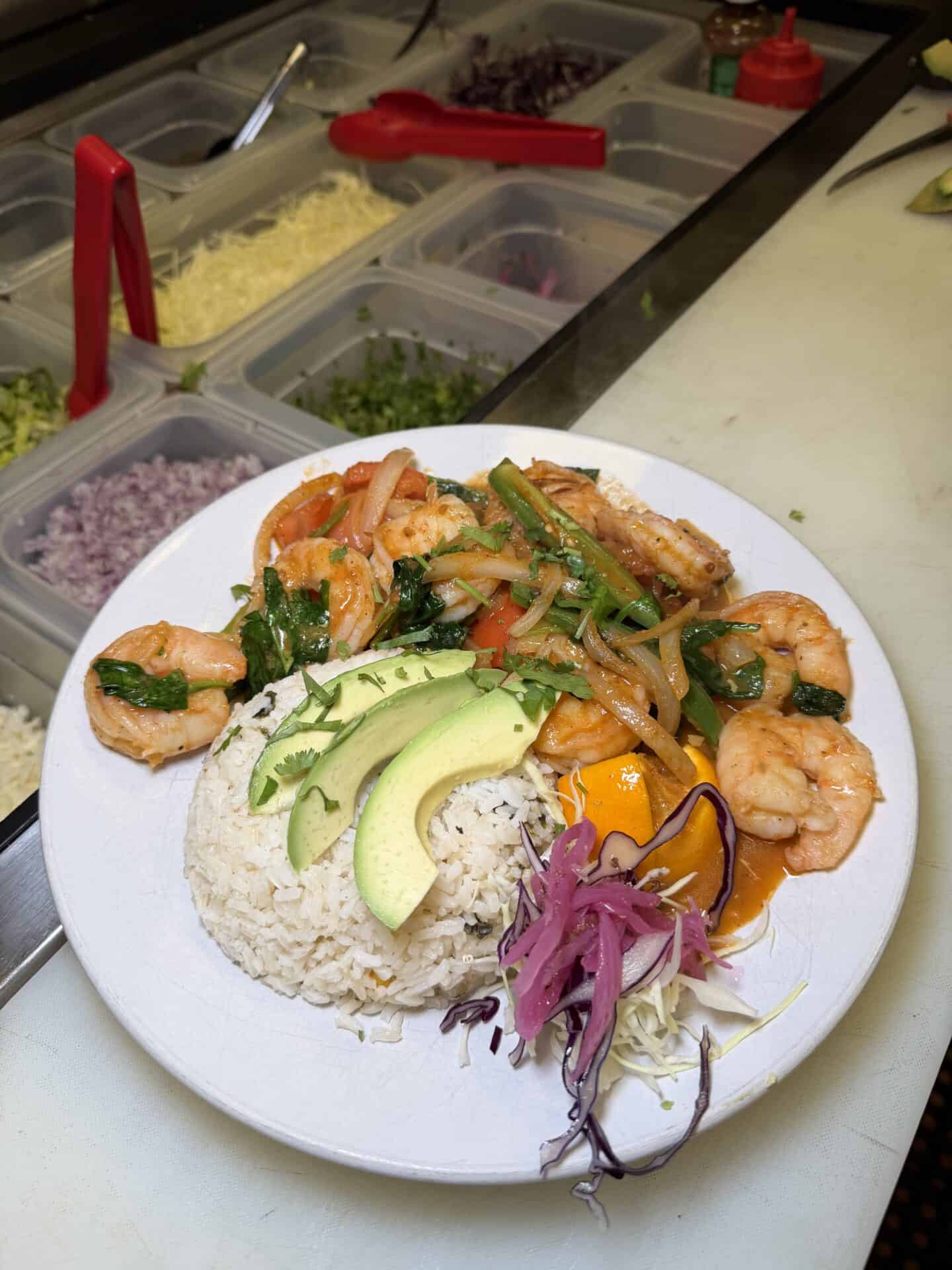 The tequila shrimp is described on their menu as this as pan-seared shrimp tossed with chipotle peppers, tomatoes, fresh spinach, onions, and serrano chiles, flambéed with tequila and a burst of fresh-squeezed orange juice. Served over poblano lime rice, garnished with shaved cabbage, pickled onion, fresh cilantro, and creamy avocado for a bright, bold experience.