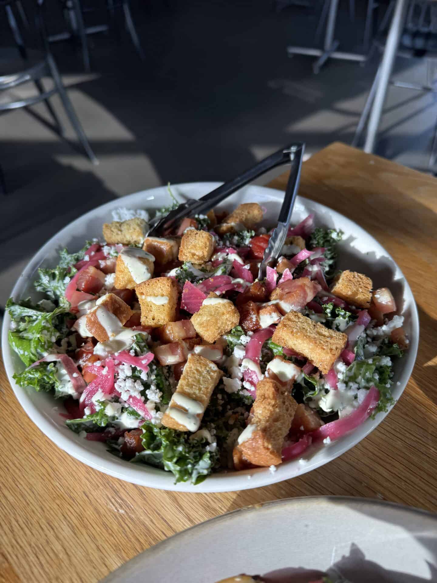 Pickled red onions, bacon, goat’s milk feta, focaccia croutons, buttermilk herb dressing – all on a bed of kale.