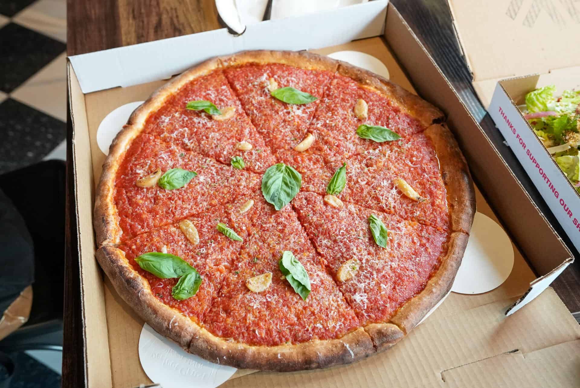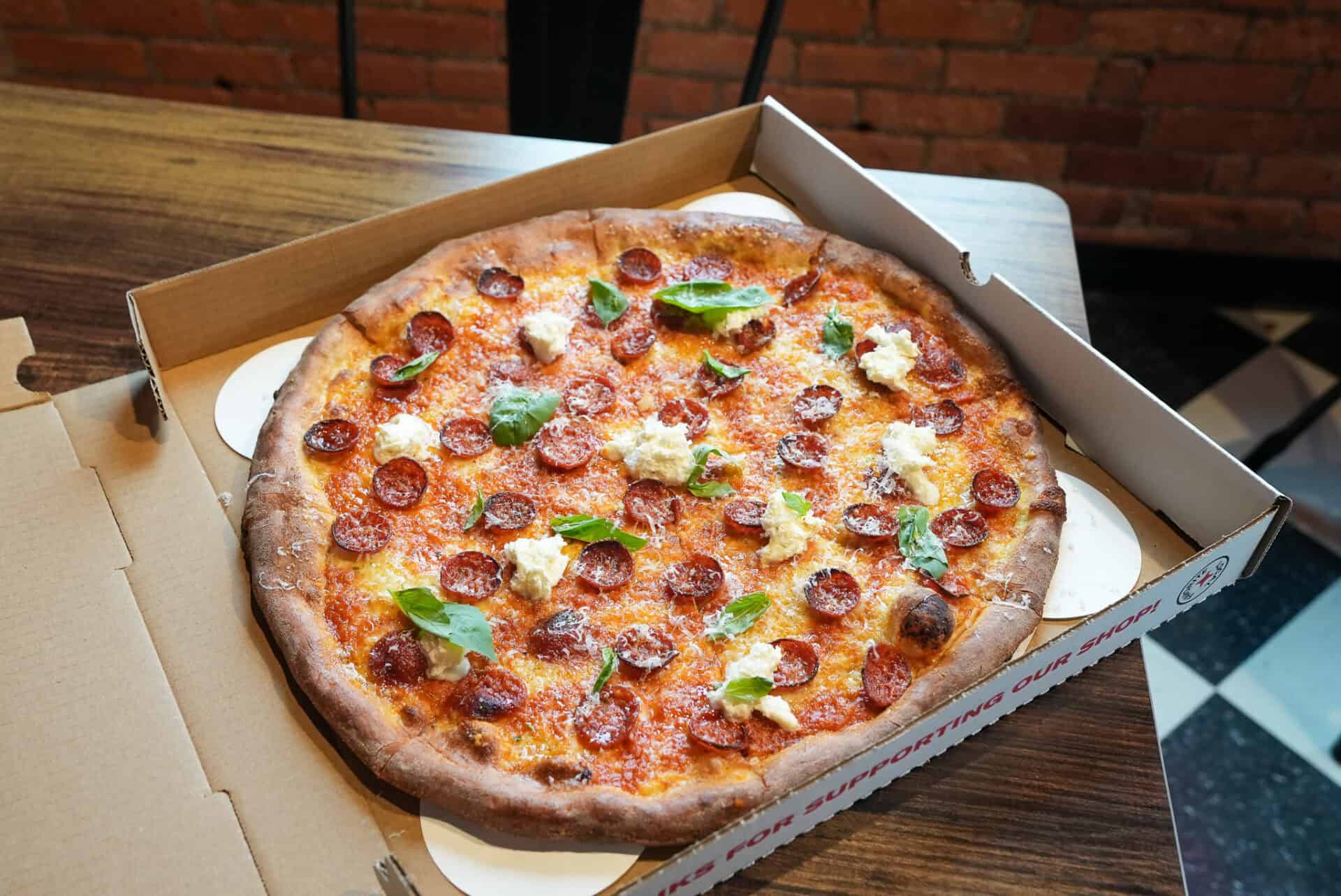 The Enzo leans the other direction: subtle vodka sauce, spicy pepperoni, bright torn basil, cooled out by house-made stracciatella.