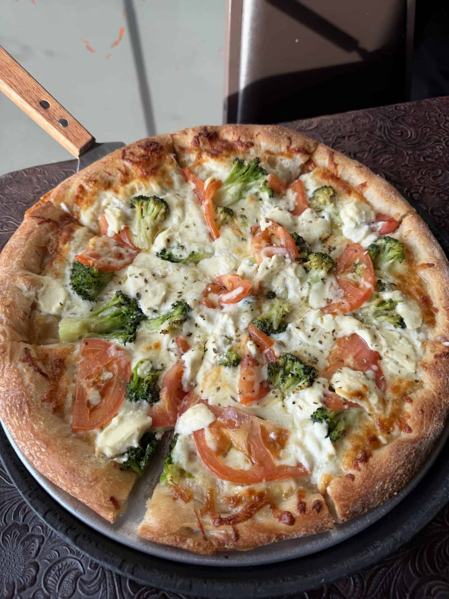 Rounding things out is the Gar-Broc-Tom, a white pizza topped with garlic, broccoli, and tomatoes.