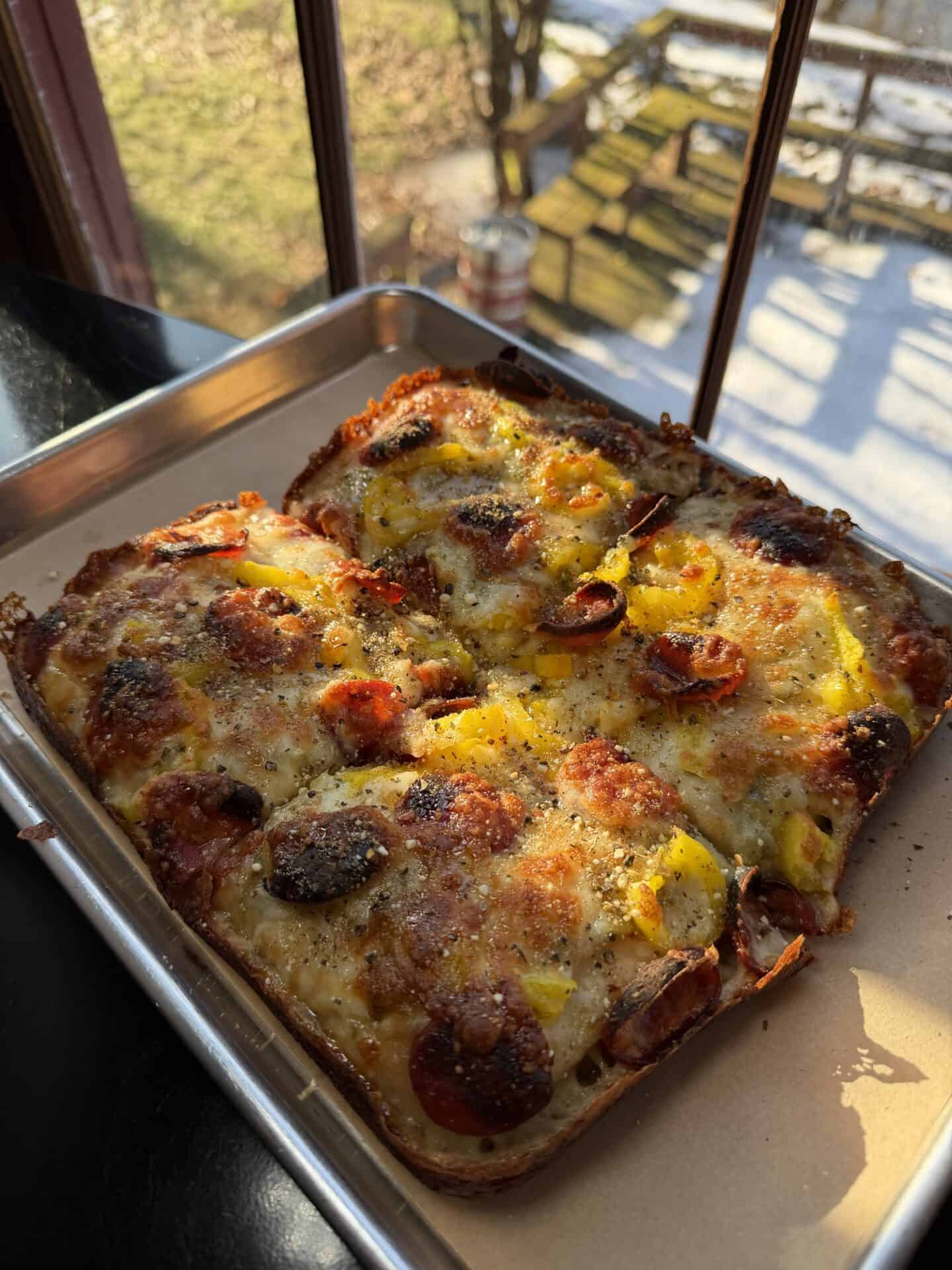 - “The Gold Digger” Grilled Cheese – made with basil honey butter, burrata, mozzarella, prosciutto, grilled peaches, and a balsamic drizzle.